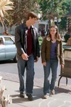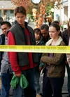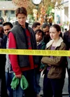 Later, Rory and Lane walk through town and come across the local grocery where there's some police tape and a chalk outline of a body. What the heck is going on here? The police think it's just a big prank, but the store owner isn't buying it. Just then, Dean arrives and he and Rory flirt away, making Lane bail. As everyone wonders just who might pull such a prank, Rory spots Jess across the street with a grin on his face. Hmmm. It won't take much detective work to figure this one out. Over at the Independence Inn, the mysterious owner arrives for a visit. Her name is Mia, and both Lorelai and Rory are pleased as to see her. And of course, Michel is his usual insulting self. The three girls head to Luke's, where he and Mia have a nice little reunion as well. Seems everyone just loves Mia, who now lives in Santa Barbara, California and hates it because it's sunny all the time. They all chat for a while and Mia spills the beans on Luke in his younger days when he used to skateboard and wore a Star Trek t-shirt every day for a year. Lorelai loves this ammunition and declares that she'll need a three-month vacation from work because she needs the time to laugh her butt off.